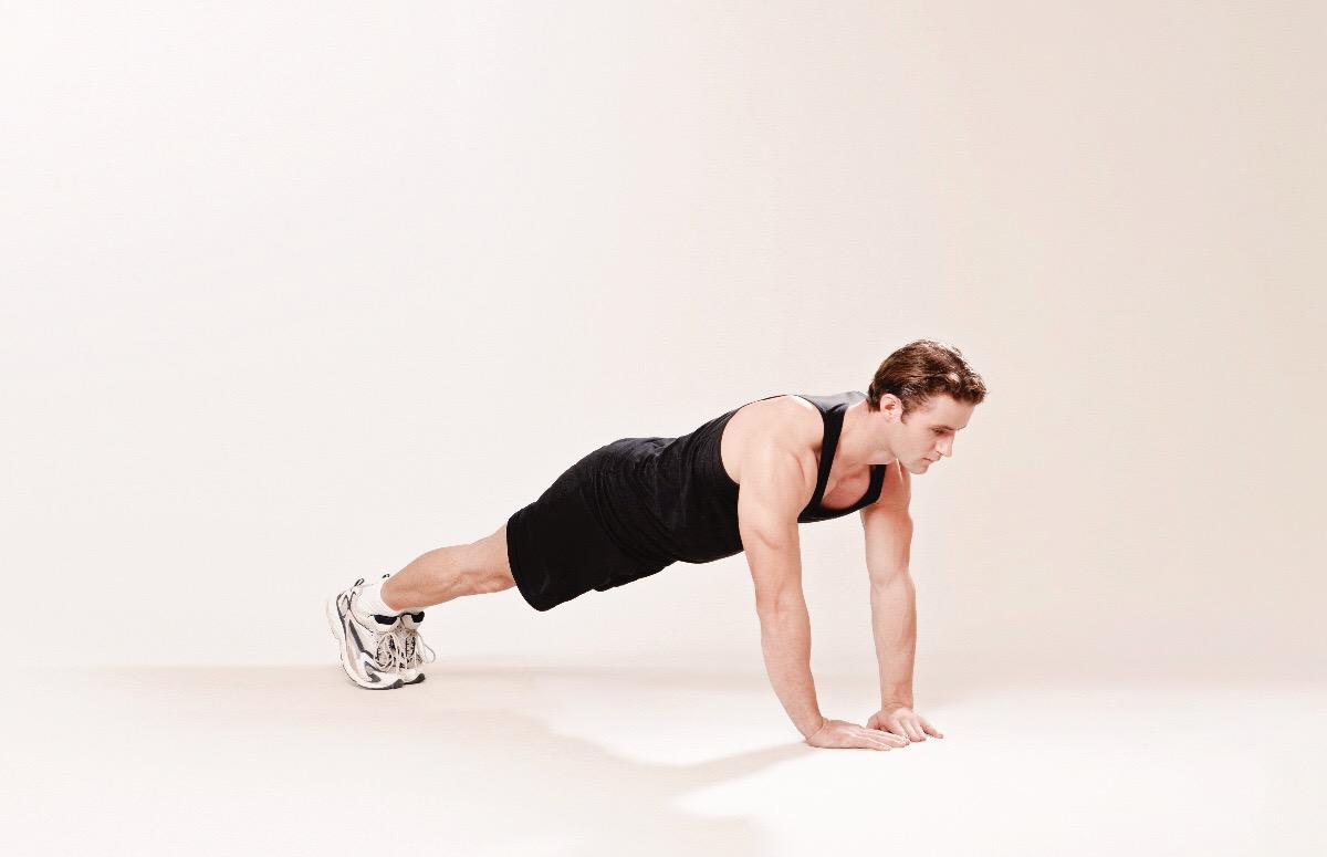 - Оторвите колени от пола, приняв классическую позицию для отжиманий, удерживая прямую линию от макушки до пяток. Избегайте прогиба в пояснице и не поднимайте таз слишком высоко.