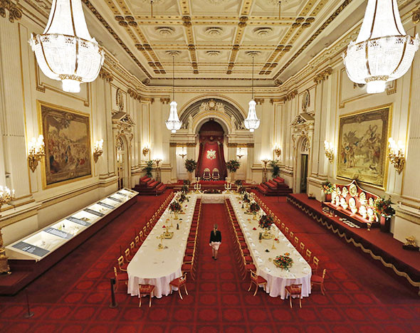 Этим летом в резиденции организована экспозиция, посвященная большим королевским приемам. Выставка в деталях рассказывает об их подготовке и проведении. Приготовления начинаются за 10 дней, а занято в них до 76 человек. В главном парадном зале приемов накрывают огромный стол длиной до 55 м, за который усаживается 170 персон. По протоколу расстояние между сервировками составляет ровно 46 см. В одном таком приеме задействовано 1700 единиц столовых приборов, 1104 предмета из стекла и хрусталя — из расчета по шесть на портрет (стакан для воды, флют для шампанского, бокалы для красного и белого вина, бокал для десертных вин и рюмка для портвейна). Посуда берется из большого сервиза короля Георга IV из 4000 предметов (чтобы упаковать и распаковать его, восемь человек будут трудиться три недели).