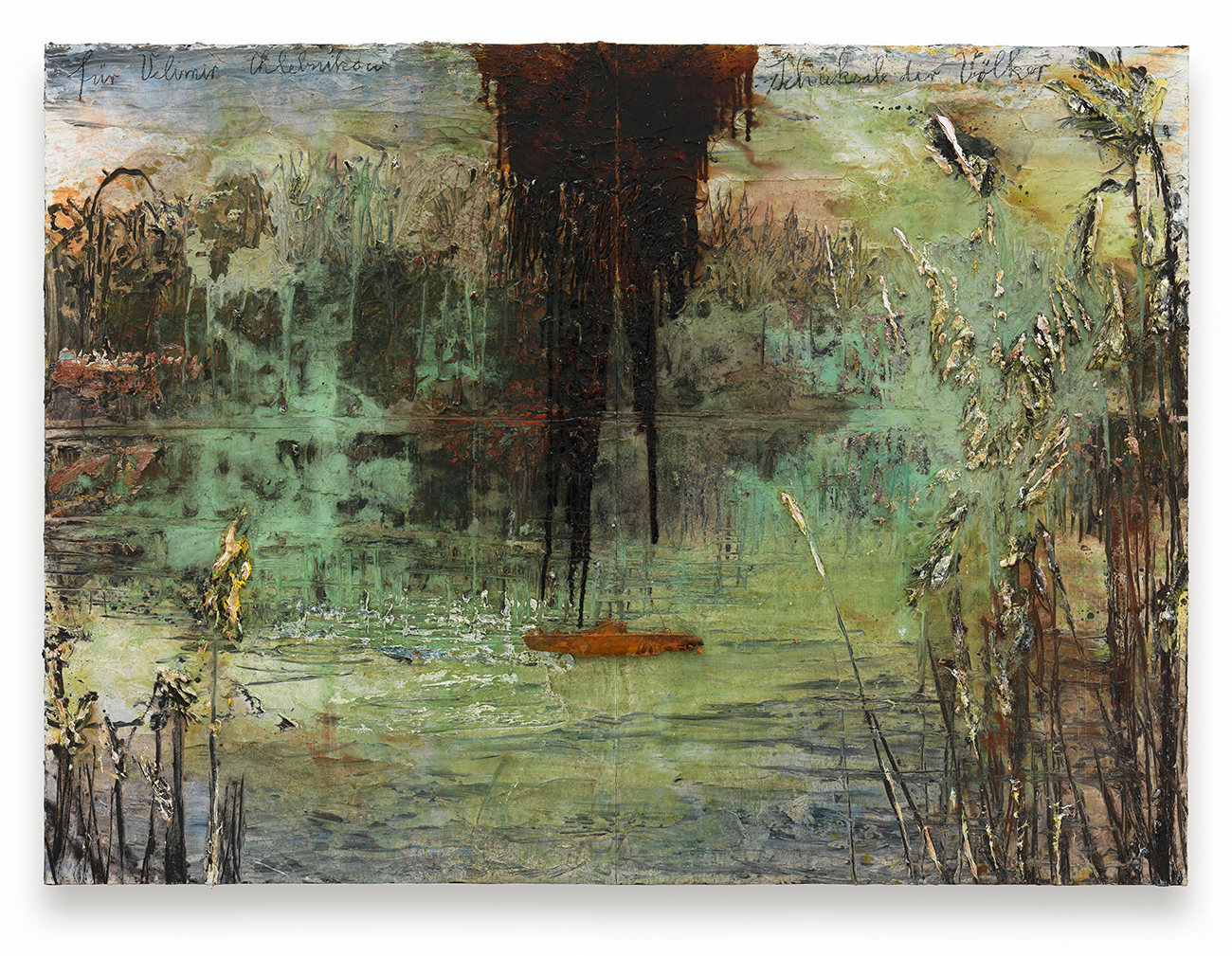 Продолжением этих раздумий стала первая персональная выставка Кифера в России, устроенная Государственным Эрмитажем. В этот раз художник обратился к произведениям футуриста Велимира Хлебникова. Хотя тот и не дожил до прихода нацистов к власти, тема войны его волновала всегда: поэт искал способы не допустить конфликтов, пытался рассчитать, сколько лет проходит между великими битвами (выходило, что 317), и писал пацифистские стихи — вспомним хотя бы его поэмы «Война — смерть» или «Война в мышеловке». К Хлебникову художник обращается не в первый раз: еще в 2004 году Кифер создал цикл полотен, на которых — любимый поэтом образ брошенных кораблей. У Кифера они таятся в камышах: кажется, стоит забросить угля в топку и дернуть руль — и они немедленно оттуда появятся, как и война, всегда присутствующая на периферии сознания поколения середины ХХ века (сам Кифер родился в последние дни Второй мировой в подвале во время бомбежки).