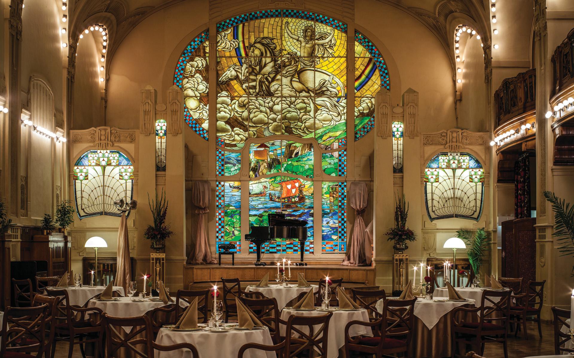 Верхний ярус ресторана «Европа» с видом на орнаментальный потолочный витраж