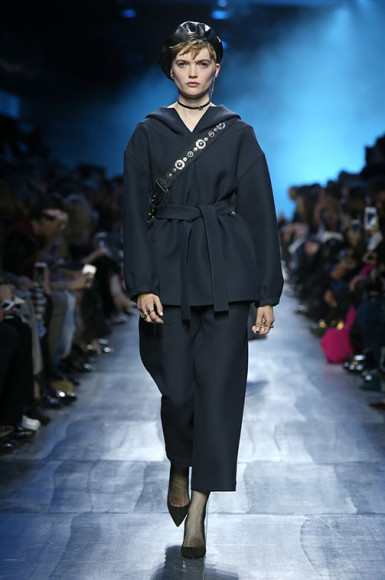 Революционный тон, заданный Марией Грацией Кьюри еще в дебютной коллекции для модного дома (к слову, она только-только поступила в магазины Dior по всему миру, хотя с момента премьеры в октябре прошлого года под эгидой дизайнера-итальянки успели представить еще pre-fall и haute couture), только усиливается. На смену фехтовальщицам пришли работницы фабрик — вроде клепальщицы Рози с небезызвестного плаката «We can do!» Рабочая одежда в исполнении марки, начинавшей с высокой моды, — и правда, чем не бунт?