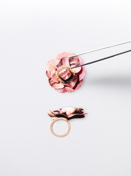 Boucheron-алхимик сумел приручить живую природу: в серии Flower ring титановая основа покрыта живыми лепестками гортензии, розы, анемона, обработанными специальным образом. Поиск чудодейственной технологии занял примерно полгода.