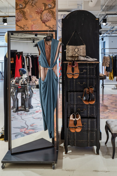 Дизайн пространства отсылает к парижским или лондонским винтажным бутикам: зеркала в пол, роскошные люстры, удобные кресла, полки с книгами о моде. И главное, манекены с редкими вещами авторства Альбера Эльбаза времен Lanvin, Фиби Фило и ее Celine, Питера Дундаса, когда он творил в Roberto Cavalli. Можно тут найти и модели Alexander McQueen, созданные при жизни Александра Маккуина.