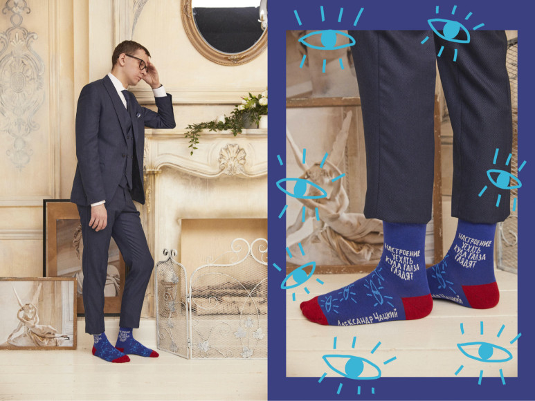 Петербургская марка St. Friday Socks показала коллаборацию с книжным сервисом MyBook — семь пар носков с надписями, продиктованными настроениями и характерами разных литературных героев. Принт «Настроение броситься под поезд» напоминает об Анне Карениной, «Настроение валяться в кровати» — об Обломове, а «Настроение уехать куда глаза глядят» — о Чацком. Родиону Раскольникову посвящена пара с разными надписями: один носок диктует настроение «иметь право», а другой — «быть тварью дрожащей». Создатели трактуют это как неопределенность, которая часто сопровождает нас с самого утра.