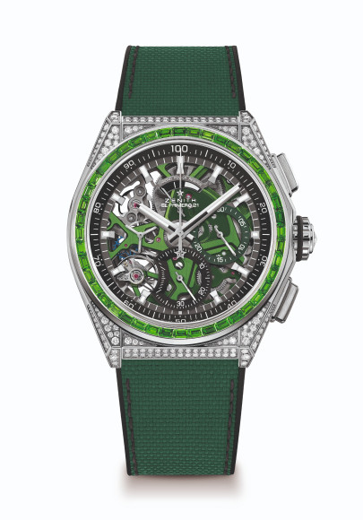 Высокочастотные хронографы оснащены революционным калибром XXI века El Primero 21, способным засекать сотые доли секунды. Каждая из пяти новинок получила стальной корпус диаметром 44 мм, полностью инкрустированный 288 бриллиантами. Безель отделан классическими синими и оранжевыми сапфирами, зелеными цаворитами, фиолетовыми аметистами и черной шпинелью. Таким образом часы различаются палитрой драгоценных камней багетной огранки на ободке, оттенком pvd-покрытия калибра El Primero 21 и цветом каучукового браслета с имитацией Cordura.