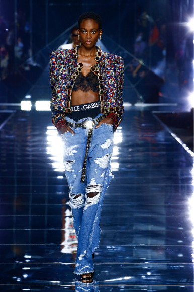 Прошедшие показы окончательно убедили нас в возвращении моды 2000-х. Однако если для большинства брендов работа с эстетикой ушедшего десятилетия в новинку, то Dolce&Gabbana в этом непревзойденный чемпион. В женской коллекции, которая продолжила идеи мужской, итальянский бренд процитировал собственные архивы и замиксовал леопардовый принт и цветочный узор, брюки с заниженной талией и футболку с портретом Дженнифер Лопес, рваные джинсы и куртку, щедро расшитую камнями и стразами, и кружевную блузу и юбку, имитировавшую дискобол. Особое место на подиуме, который, к слову, не уступал одежде в яркости (в сет-дизайне были использованы зеркальный подиум, граненый фон и не менее 75 прожекторов), занял камуфляж. Dolce&Gabbana дал вторую жизнь военному дедстоку, превратив его в объемную куртку с меховой подкладкой, ботфорты и брюки, из-под которых выглядывало брендированное нижнее белье.