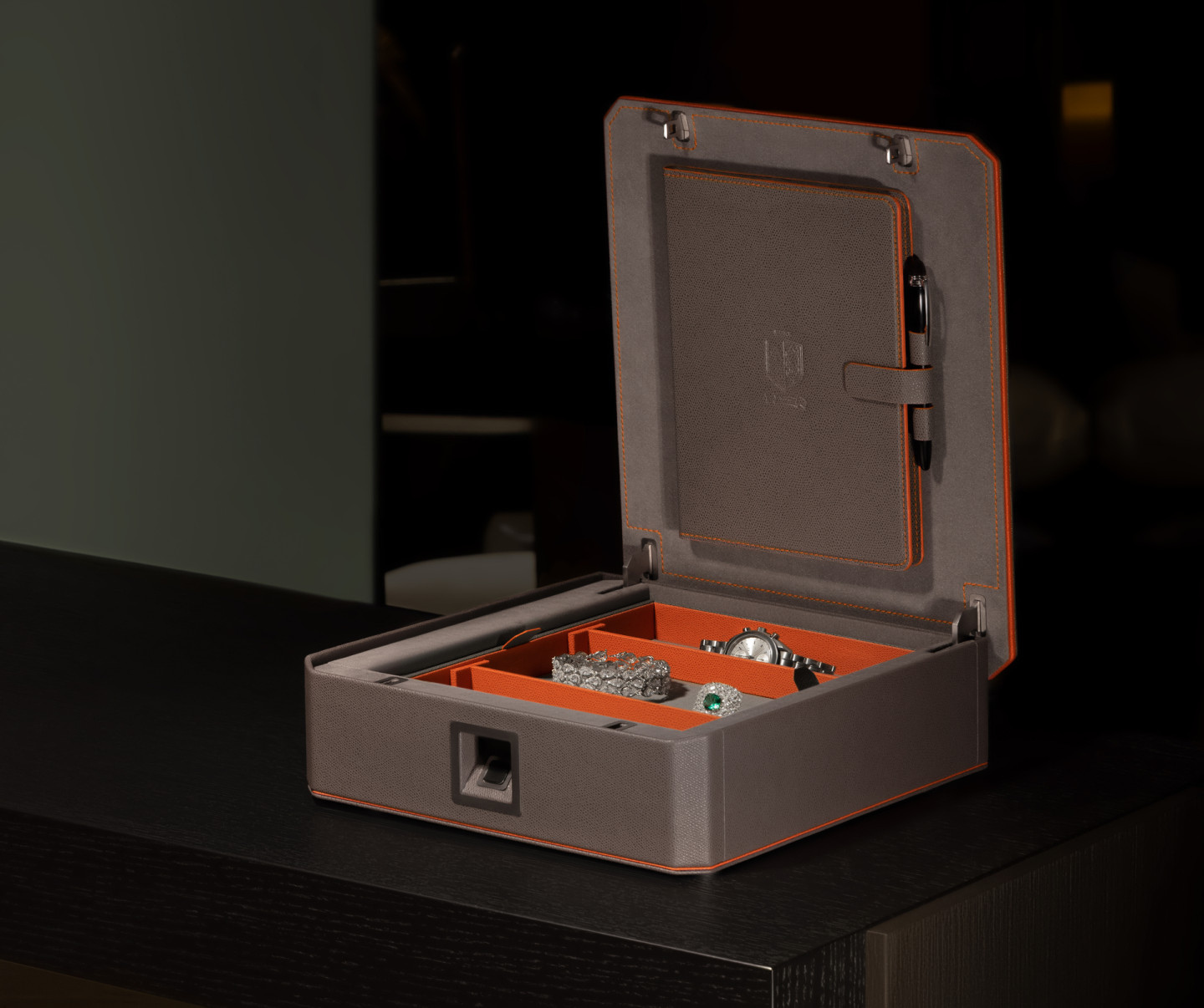 Стильное решение для хранения документов, аксессуаров, денег и других ценностей. Снаружи стальной корпус системы хранения вручную обшит натуральной кожей из Италии, а внутри — тканью алькантара, которая используется в отделке салонов автомобилей премиум-класса и некоторых элементов космического корабля Dragon V2 от SpaceX.