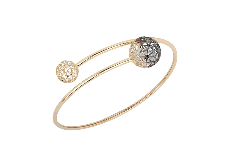 В коллекции Bigo мы не найдем эмали — только ажурные сферы, сплетенные из филигранных золотых нитей. Прием не новый, но именно в руках дизайнеров Roberto Bravo золотые шары превратились в увлекательную стилистическую игру: они украшают незамкнутые браслеты и двойные кольца, серьги-кисточки, асимметричные колье, длинные сотуары переменной длины. Присмотритесь: внутри шара из тонкого золотого кружева заключен еще один, из чистого полированного золота или полностью усыпанный бриллиантами.