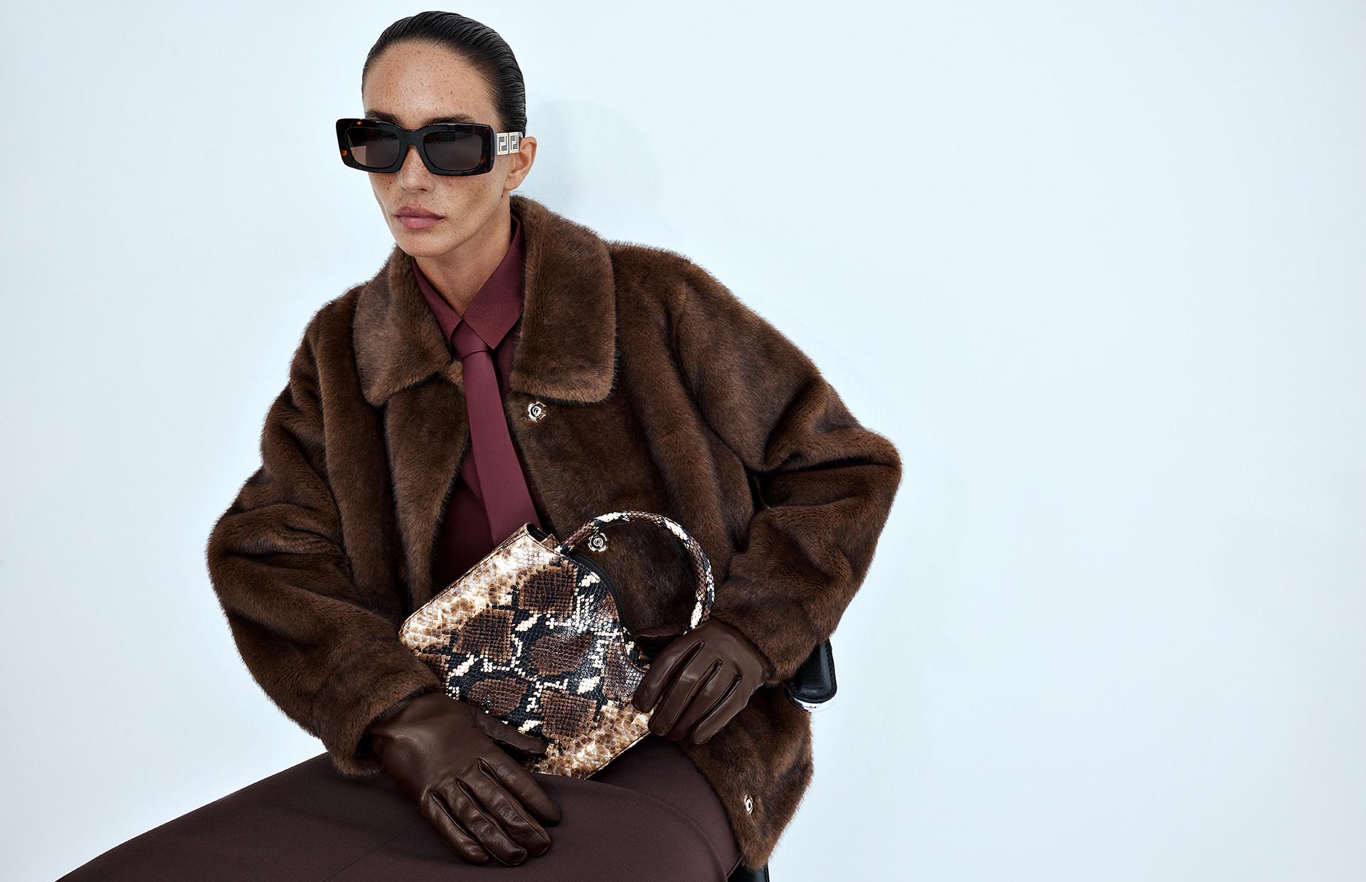 Еще один ключевой прием съемки — микс разнофактурных материалов в единой цветовой палитре. Пальто Seventy, сумка Le Silla с тиснением под питона и сапоги Principe di Bologna из гладкой кожи образуют красивый единый образ.