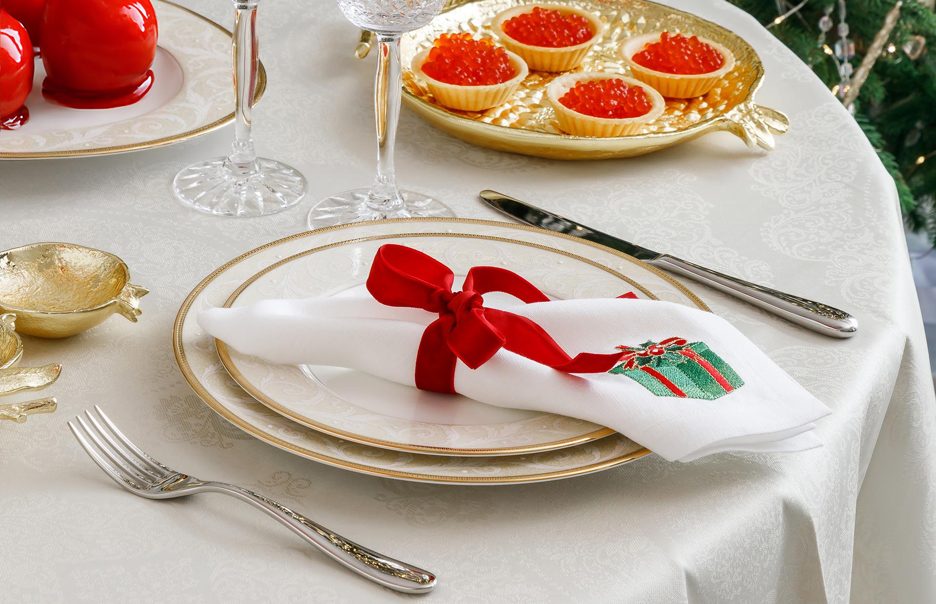 Здесь каждая деталь сервировки подчеркивает торжественность праздничной ночи. В центре внимания — сервиз «Золотой ноктюрн» от Narumi. Тончайший японский костяной фарфор словно светится изнутри, а рельефные жемчужины на золотой кайме ловят огни свечей, создавая эффект блеска звезд на поверхности тарелок и блюд. Большое внимание в таком варианте классической сервировки уделяется деталям.