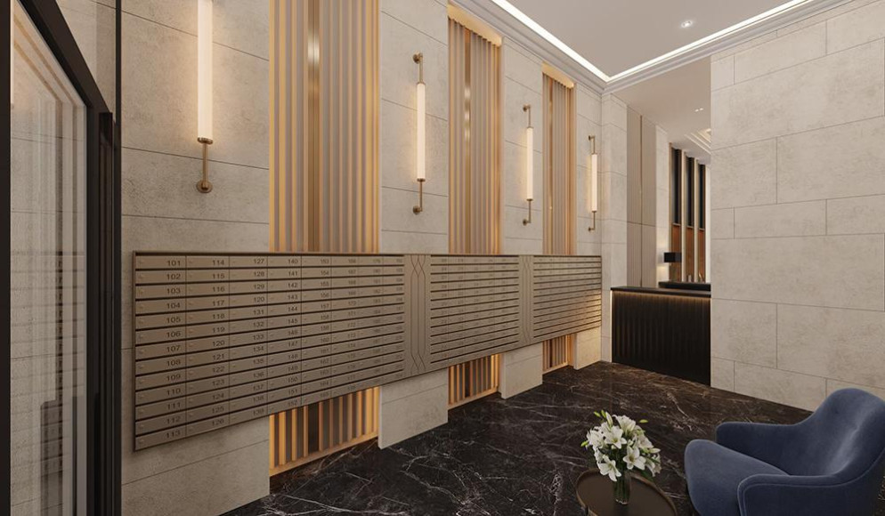 Элементы интерьера продолжают тот же самый стиль — как в лобби и фитнес-зале (панно воспроизводят реплики Дейнеки), так и в подземном паркинге. Лобби с высокими окнами и камином украшают латунные декоративные элементы и расположившиеся в нишах сверкающие металлом скульптуры, так любимые архитекторами ар-деко. Как лобби, так и типовые этажи отделаны керамогранитом. В духе наследия 1920-х выполнены и мельчайшие детали, включая даже номера на почтовых ящиках. Дизайну внутренних пространств вторит мощение прогулочного бульвара с фонтаном — это еще одно напоминание о роскошной эпохе прошлого века.